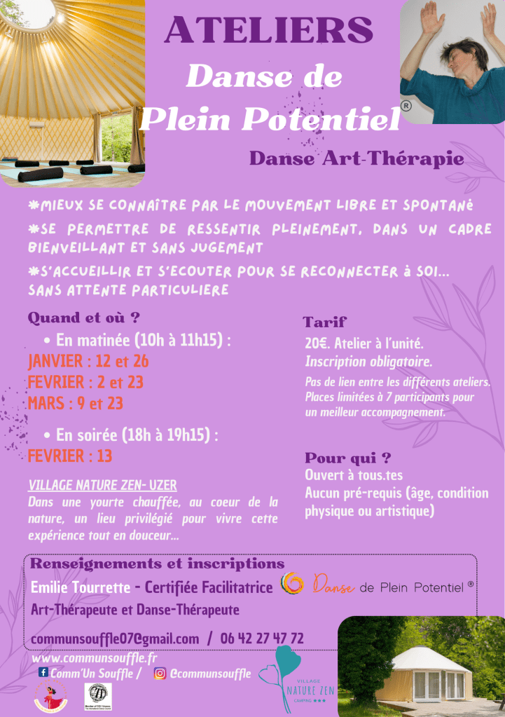✨ Notre thérapeute Émilie vous propose des ateliers d’art-thérapie et de danse-thérapie (Danse de Plein Potentiel), en individuel ou collectif. Elle accueille toutes personnes souhaitant donner sens à leur vie ou rencontrant des difficultés diverses.