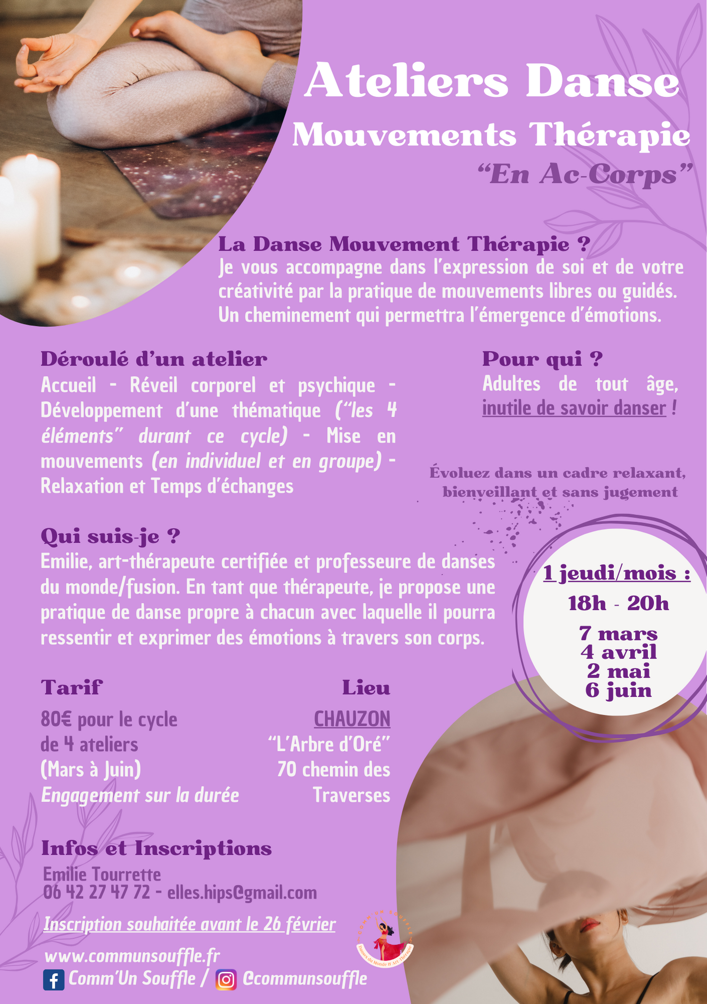 Afin de bien démarrer l’année 2024, nous sommes ravis de vous présenter nos tout nouveaux ateliers de Danse Mouvements Thérapie « En Ac’Corps » avec Émilie, art-thérapeute certifiée et professeure de danses du monde/fusion !