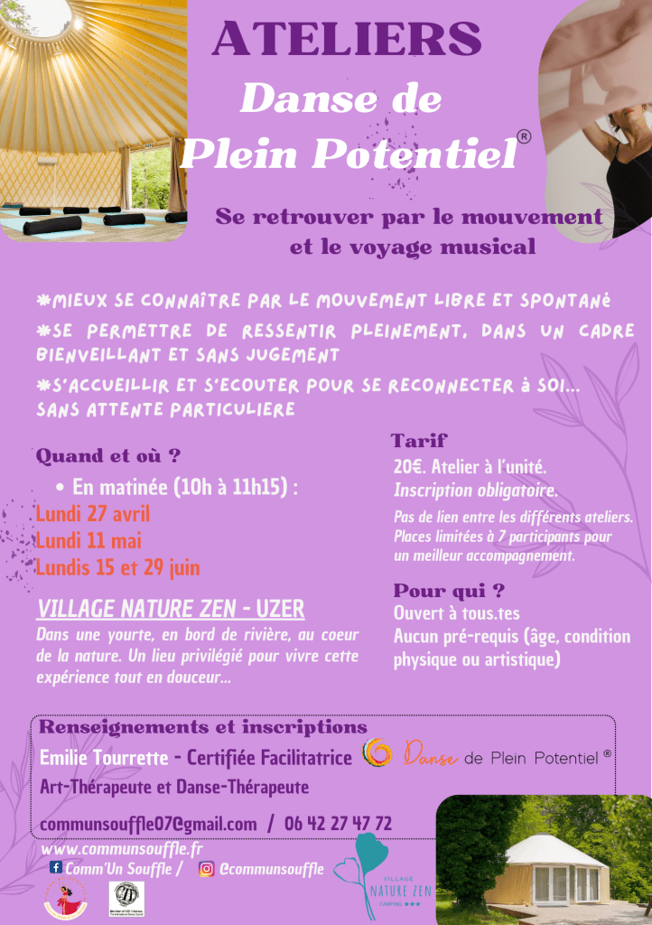 Depuis peu, elle propose également des ateliers d’Art-Thérapie et de Danse Thérapie en individuel (sur la commune d’Uzer 07 Ardèche) ou collectif.